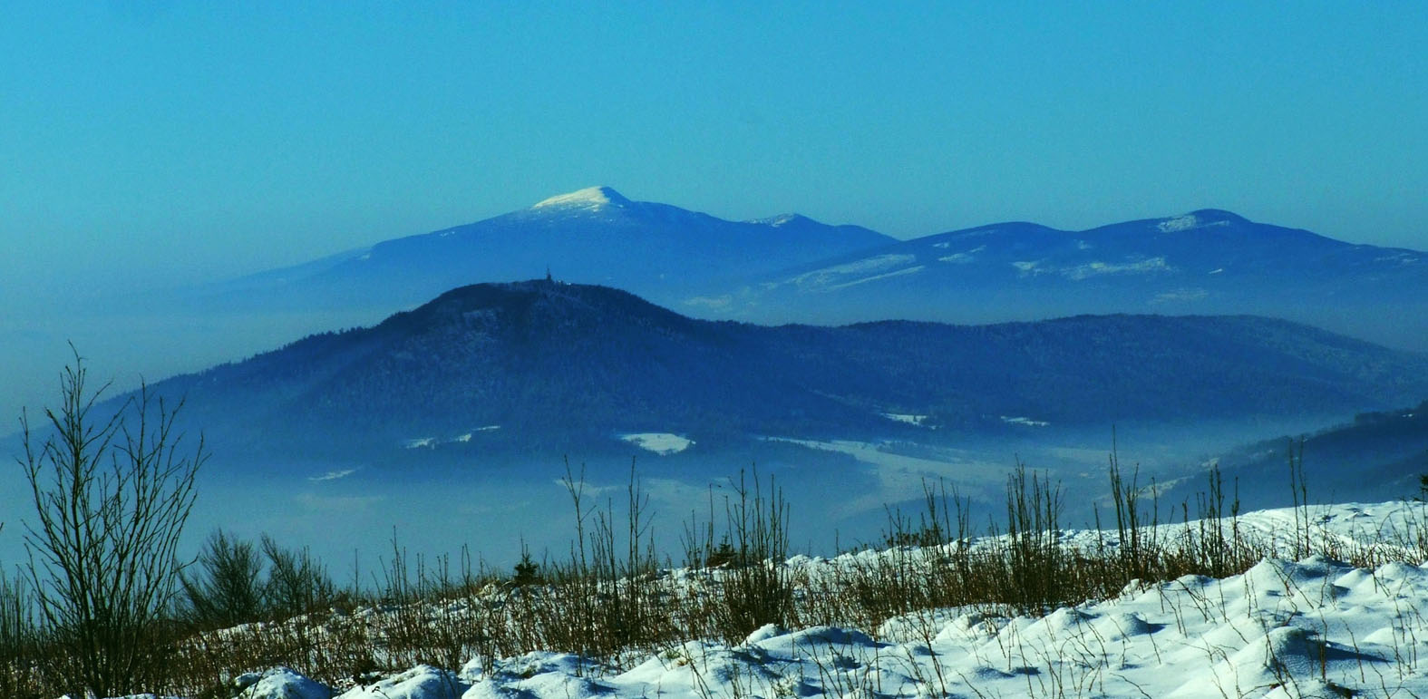 Polica i Babia Góra, zaśnieżony stożek to najwyższa kulmnacja masywu, przesławny Diablak. Widok z Ćwilina w Beskidzie Wyspowym